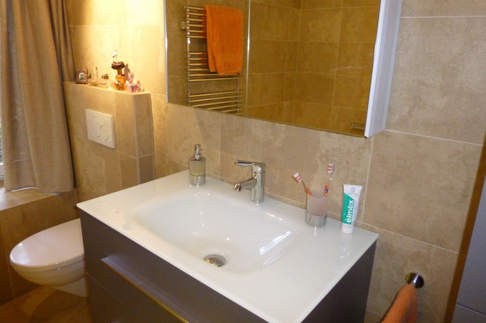 Wir nutzen den Abstellraum, um den Badbereich zu vergrössern und neue Staufläche zu schaffen. Er wurde in eine Nasszelle mit Dusche umfunktioniert und das ehemalige Bad wurde komplett modernisiert. Beide Räume wurden im gleichen Stil eingerichtet, um die Harmonie zu unterstreichen. Wir verwendeten sanfte Farben und helle Materialien. Das Bad erhielt eine Glasduschkabine, ein Corian Waschbecken und massive Holzmöbel. Eine niedrige Wand trennt das WC vom übrigen Raum ab. Es entstand ein grosszügiger Raum, der zum Verweilen einlädt.