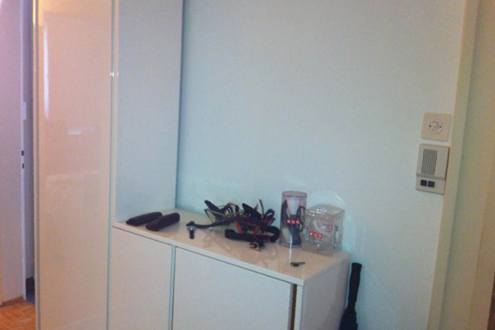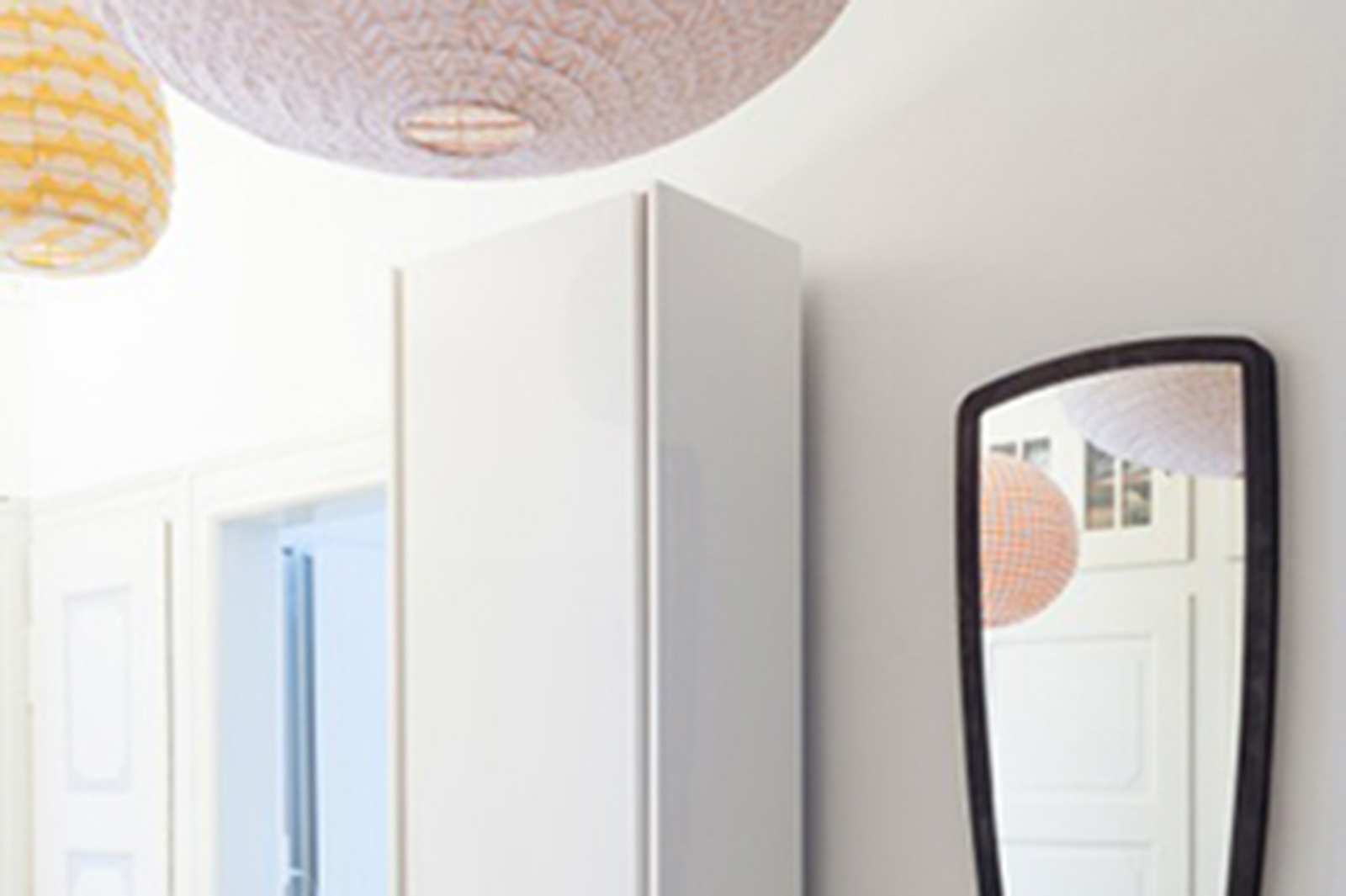 Der Eingangsbereich der ansonsten sehr schön eingerichteten Wohnung war unpraktisch und eher düster mangels einer natürlichen Lichtquelle und vieler abgehender Türen. Die Bewohner wünschten sich mehr Komfort und Fröhlichkeit. Auf dem bestehenden Sideboard haben wir deswegen einen schwarzen Stahlspiegel von Caravane aufgehängt. Dieser bringt einen schönen Kontrast zu den eher tristen Wänden. Ausserdem wurden drei farbigen Papierlampen an die Decke gehängt, die am Abend, bei eingeschaltetem Licht, wie tanzende Laternen aussehen. Um den Eingangsbereich praktischer zu gestalten, haben wir einen grossen Sisal Teppich von Ikea hinzugefügt, einen Garderobenhaken angebracht, sowie einen bequemen Hocker aus Bambus von KoK essentiel aufgestellt.