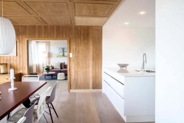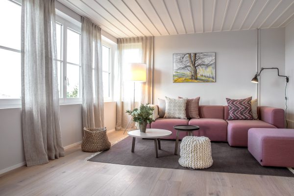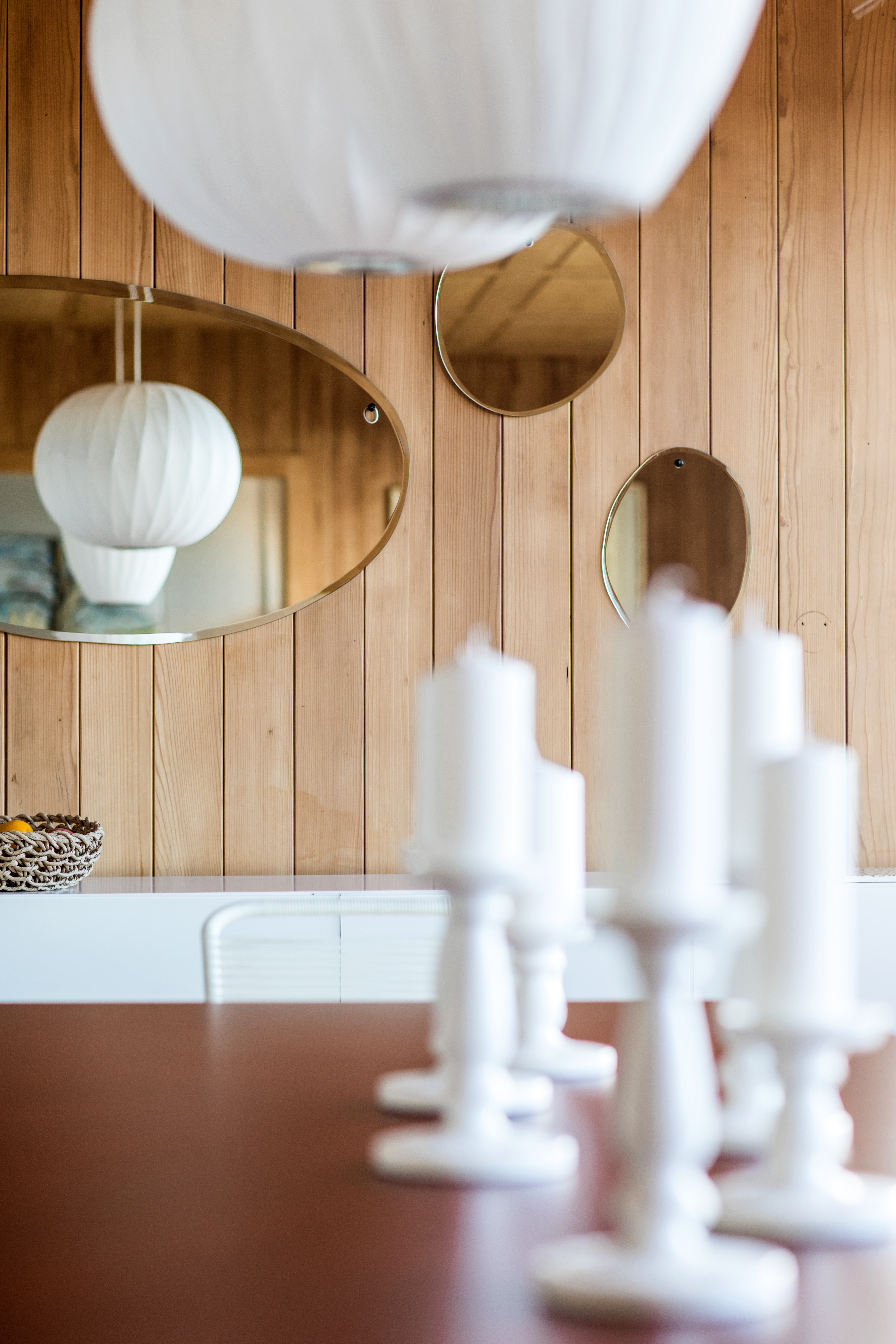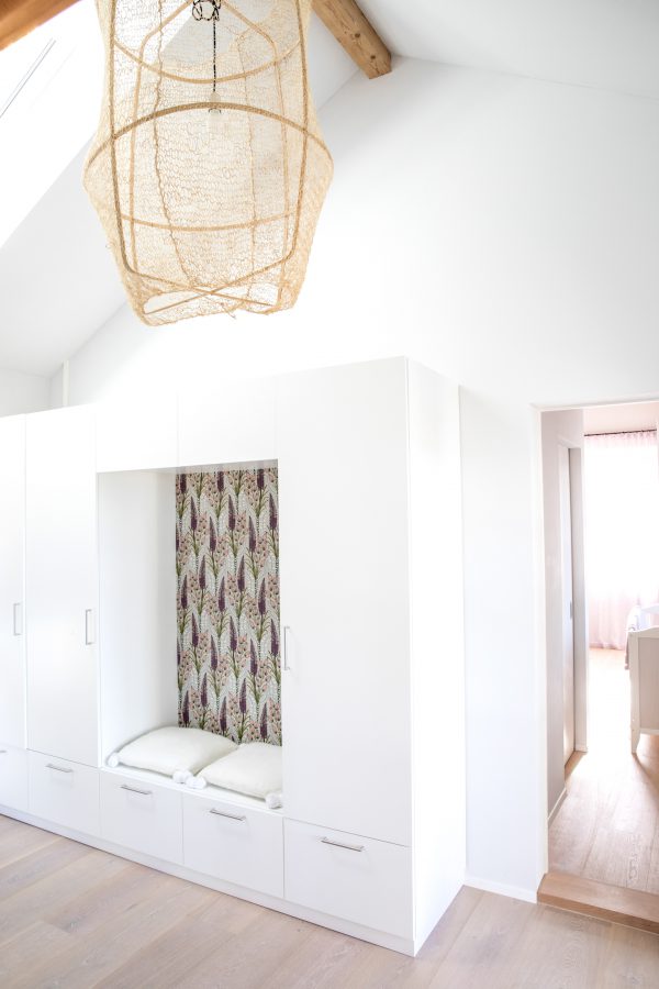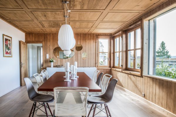 Bei dieser Renovation eines Einfamilienhauses aus den 50iger Jahren durfte ich die Kunden von Anfang an begleiten. Der Umbau wurde von einem Architekten unterstützt und ich wurde für das visuelle Konzept, den Stil, die Farbkombinationen und die Möblierung engagiert. Die Entscheidungsfindung war ein langer Weg und führte über die Auswahl der Böden, der Fliesen, des Farbkonzepts und der Schreinerarbeiten bis hin zu der «philosophischen» Frage: Wieviel des «alten Hauses» sollte noch «im neuen Haus» enthalten sein? Die Holzwände und die Decke des Esszimmers waren zu schön und authentisch, um weiss verputzt zu werden, grössere Fenster waren jedoch willkommen. Mein Input bezüglich der gewünschten Einbaumöbel, wie Schränke, der Garderobe, einer Bank im Eingangsbereich sowie eines Sideboards resultierte in nicht nur praktischen, sondern auch ästhetischen Stauraumlösungen. Das Farbkonzept des Hauses ist durch bordeaux, rosa, blau und grau geprägt. Das wunderschöne Sofa von Hay ist ein toller Farbakzent im Wohnzimmer. Viele andere Möbel wurden bei Vitra ausgesucht. Insgesamt gesehen wurde bei der Auswahl der Farben und Möbel etwas gewagt: ein XXL Prouvé Tisch, zeitlose Lampen von George Nelson, Ay Illuminate und Gras, coole Kissen von Maison de Vacances, wuschelige Teppiche und eine Gruppe von poetischen Spiegeln an der Holzwand. Den letzten Schliff bringen die schönen luftigen Vorhänge, die dem Haus noch mehr Gemütlichkeit verleihen.