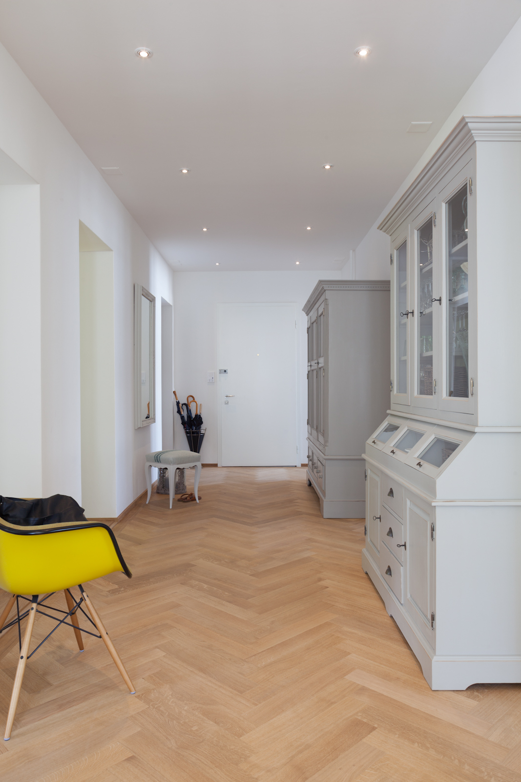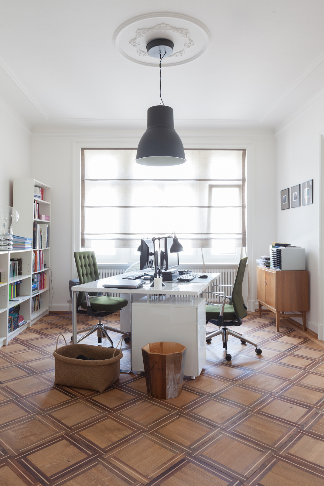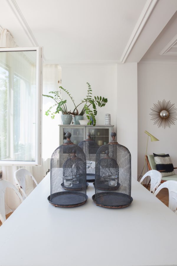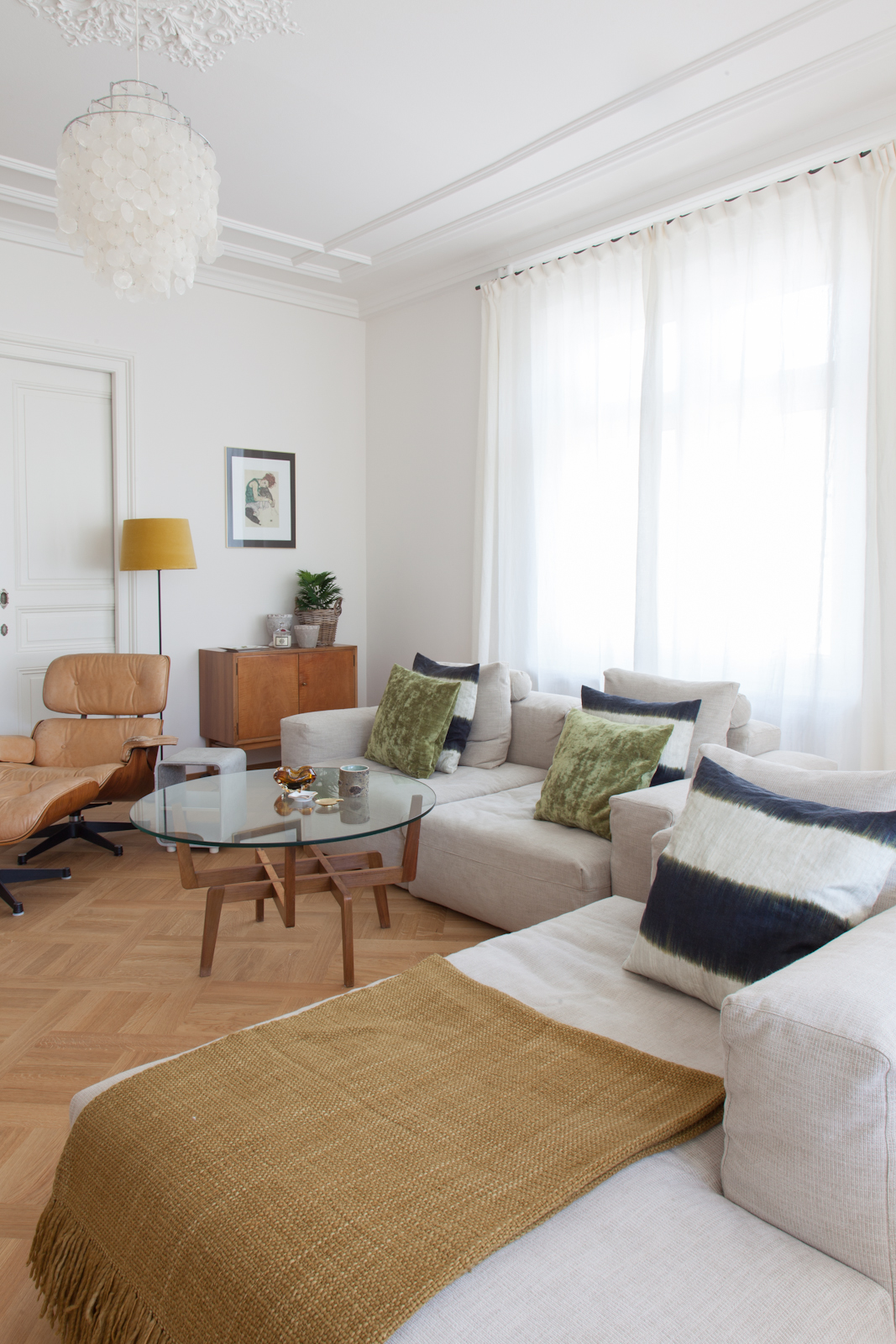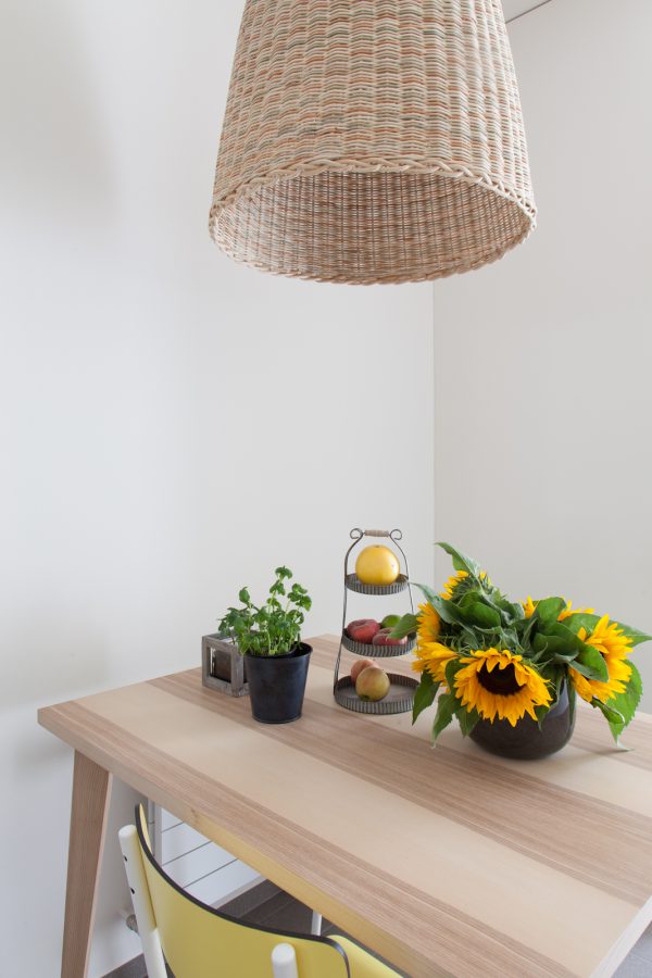 Meine Aufgabe bestand darin, einen Kinder- sowie einen Arbeitsbereich in dieser grosszügigen und lichtdurchfluteten Wohnung zu erschaffen. Das Paar besass schon wunderschöne und erlesene Möbelstücke, die durch neue Accessoires, Stoffe und Beleuchtung kombiniert werden mussten. Bei der Beleuchtung suchten wir nach Originalen, wie z.B. 50’er Jahre Stücken für das Schlafzimmer (Urban Bliss in Zürich). Im Arbeitszimmer verwendeten wir eine einfache IKEA Lampe, die zusammen mit den Schreibtischlampen von Gras dem Raum einen maskulinen Touch geben. Wir wählten schöne elegante Stoffe für die Vorhänge und Rollos aus (Sanderson, Lizzo, Designers Guild). Die ethnischen Teppiche im Kinder- und Wohnzimmer runden das Bild ab. Im Flur wurden Marktkörbe aus Bast an die Wände gehängt, um zusätzlichen Stauraum zu schaffen. Die gleiche Idee setzten wir im Babyzimmer mit kleinen Vogelhäusern aus Holz um. Dieses Zimmer sollte das Hauptaugenmerk sein: violette Wände (Farrow & Ball), grau gewaschene Möbel und gelbe Vorhänge geben einen wundervollen und gewagten Mix und lassen das Babyzimmer einzigartig aussehen!
