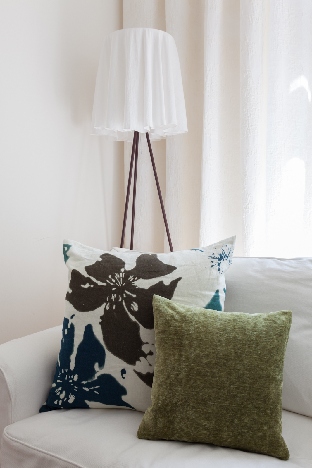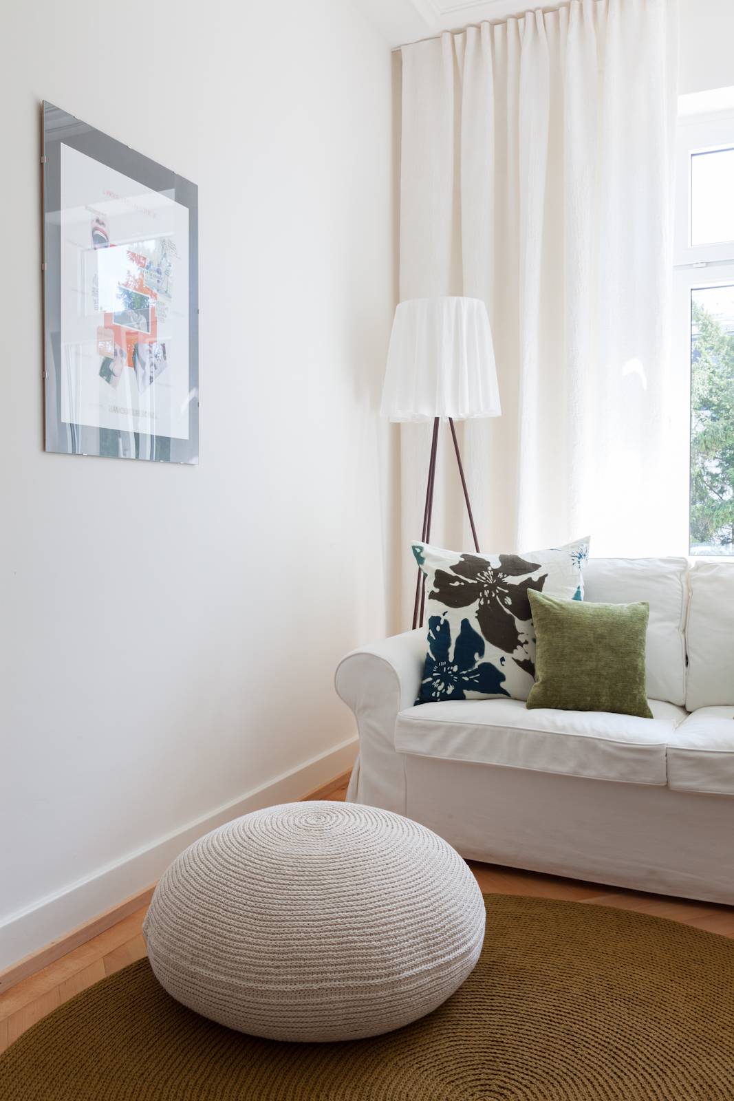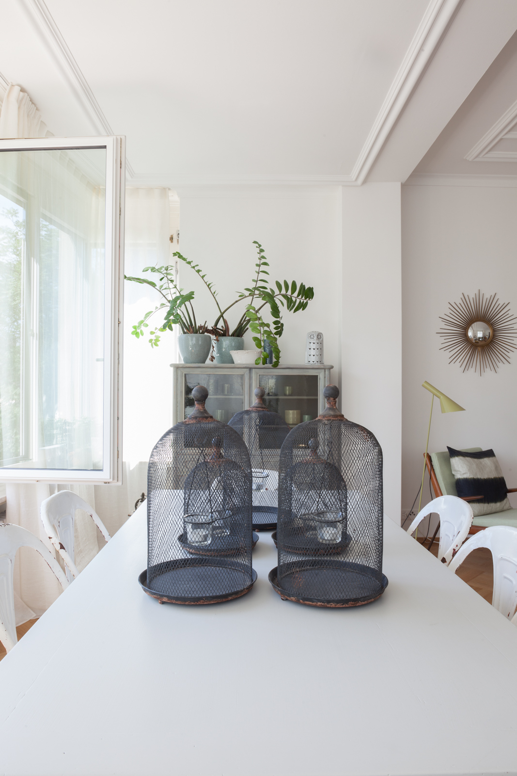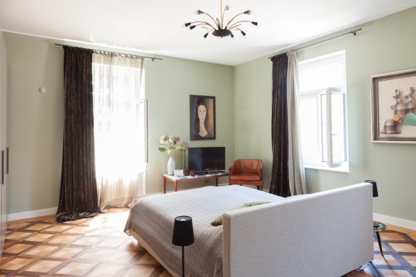 Meine Aufgabe bestand darin, einen Kinder- sowie einen Arbeitsbereich in dieser grosszügigen und lichtdurchfluteten Wohnung zu erschaffen. Das Paar besass schon wunderschöne und erlesene Möbelstücke, die durch neue Accessoires, Stoffe und Beleuchtung kombiniert werden mussten. Bei der Beleuchtung suchten wir nach Originalen, wie z.B. 50’er Jahre Stücken für das Schlafzimmer (Urban Bliss in Zürich). Im Arbeitszimmer verwendeten wir eine einfache IKEA Lampe, die zusammen mit den Schreibtischlampen von Gras dem Raum einen maskulinen Touch geben. Wir wählten schöne elegante Stoffe für die Vorhänge und Rollos aus (Sanderson, Lizzo, Designers Guild). Die ethnischen Teppiche im Kinder- und Wohnzimmer runden das Bild ab. Im Flur wurden Marktkörbe aus Bast an die Wände gehängt, um zusätzlichen Stauraum zu schaffen. Die gleiche Idee setzten wir im Babyzimmer mit kleinen Vogelhäusern aus Holz um. Dieses Zimmer sollte das Hauptaugenmerk sein: violette Wände (Farrow & Ball), grau gewaschene Möbel und gelbe Vorhänge geben einen wundervollen und gewagten Mix und lassen das Babyzimmer einzigartig aussehen!