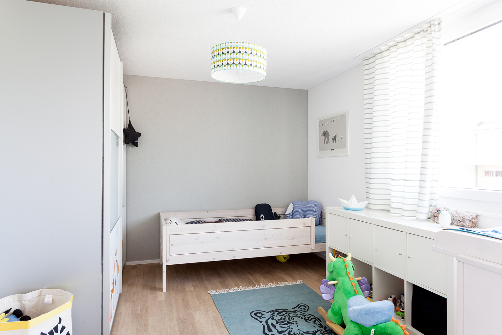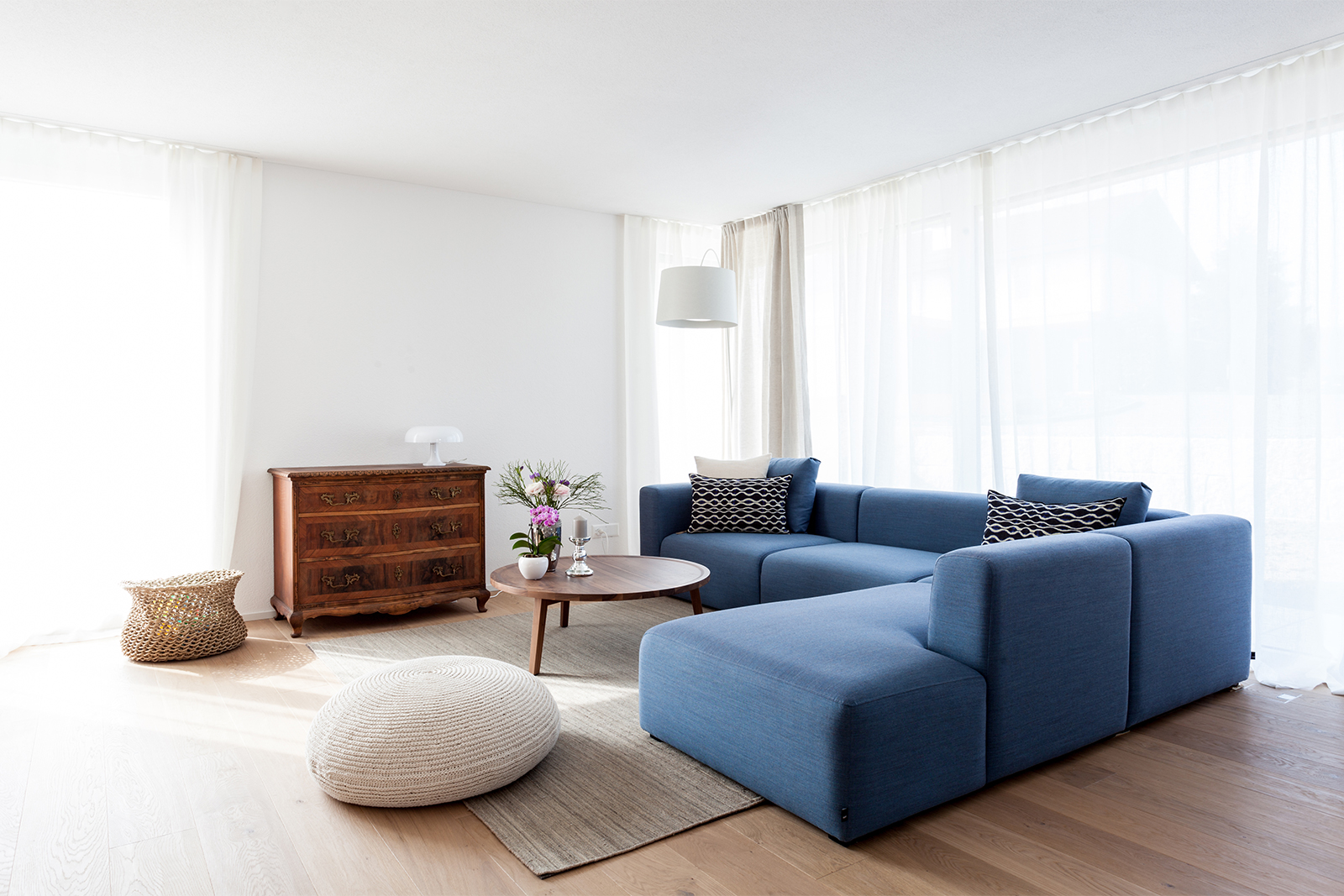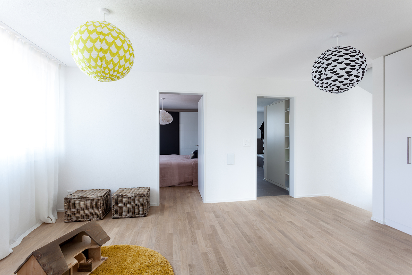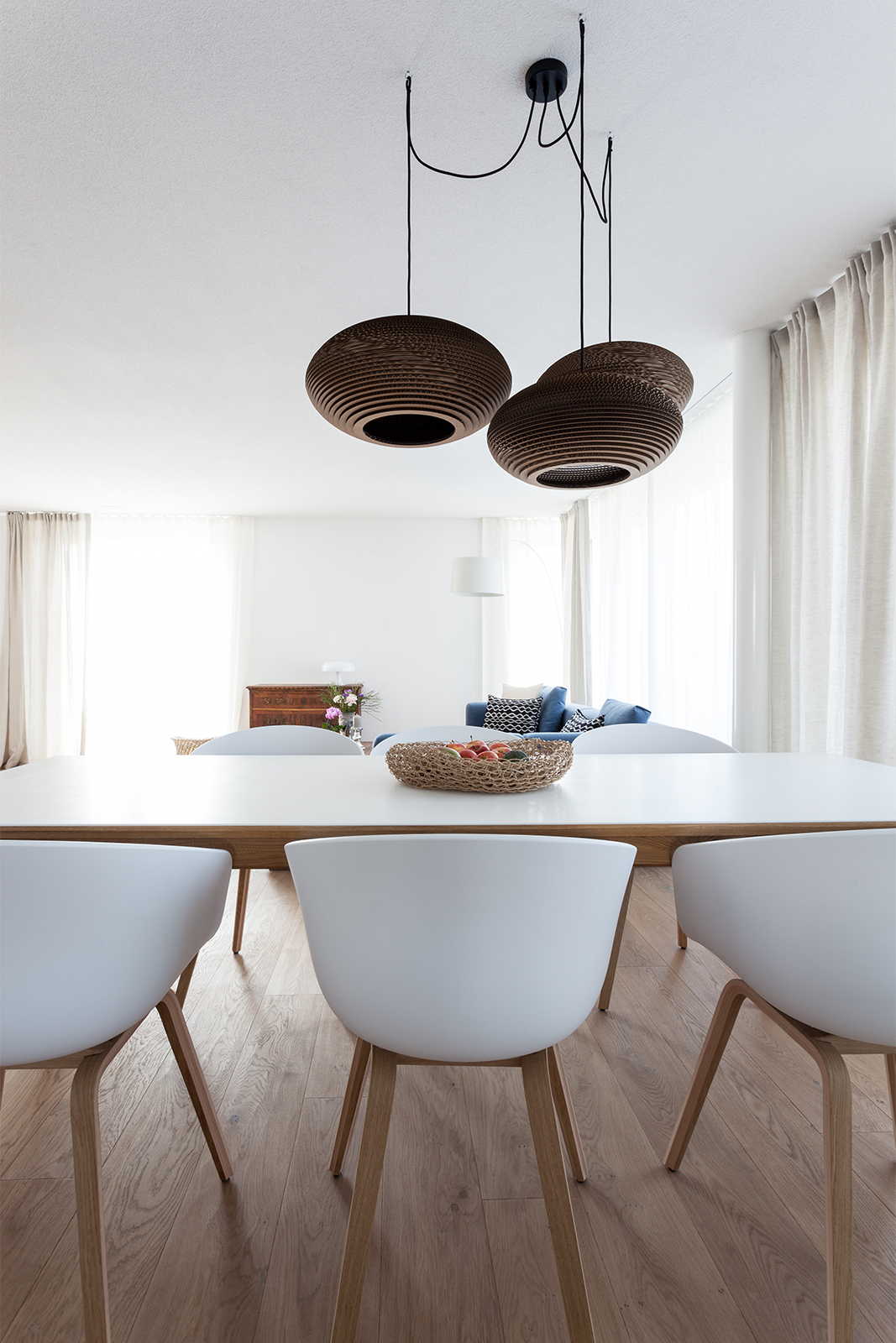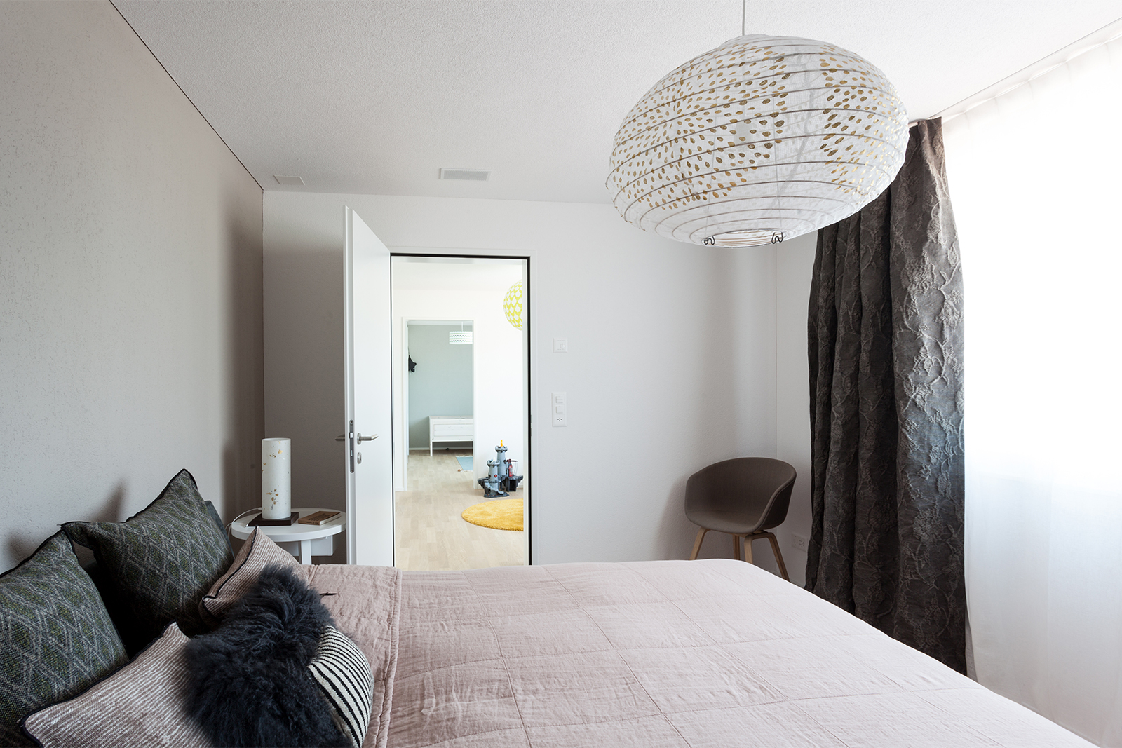 Diese junge Familie, die Käufer eines neuen modernen Hauses brauchten Unterstützung bei der kompletten Einrichtung ihres neuen Zuhauses. Wir definierten ein genaues Konzept und planten die Farben, den Stil und das Budget für alle drei Etagen des Hauses. Einige vorhandene Möbel wie z.B. Betten, Schränke, eine Kommode, und ein Sideboard wurden behalten, neue fröhliche und frische Möbel haben wir hinzugefügt. Wir definierten auch die Wand- und Bodenfarben und die Einrichtung der Bäder. Alles sollte schlicht aussehen und eine gewisse Leichtigkeit haben. Auch die neue Möbel, Leuchten und Accessoires wurden entsprechend dieser Philosophie ausgesucht: luftige, schlichte und schöne Materialien, vom Preis her im mittleren Segment. Wir suchten ein Bluejeans Sofa und Stühle von Hay aus, Lampen von Graypants und mehrere Accessoires von Muubs. Ein Hauch von Luxus durfte trotzdem nicht fehlen, so ergänzten wir mit Vorhänge und Textilien von Society und Maison de Vacances und Leuchten von Foscarini und Paris au mois d’août. Entstanden ist ein freundliches, einladendes Haus, welches genug Raum hat für die noch wachsende Familie.