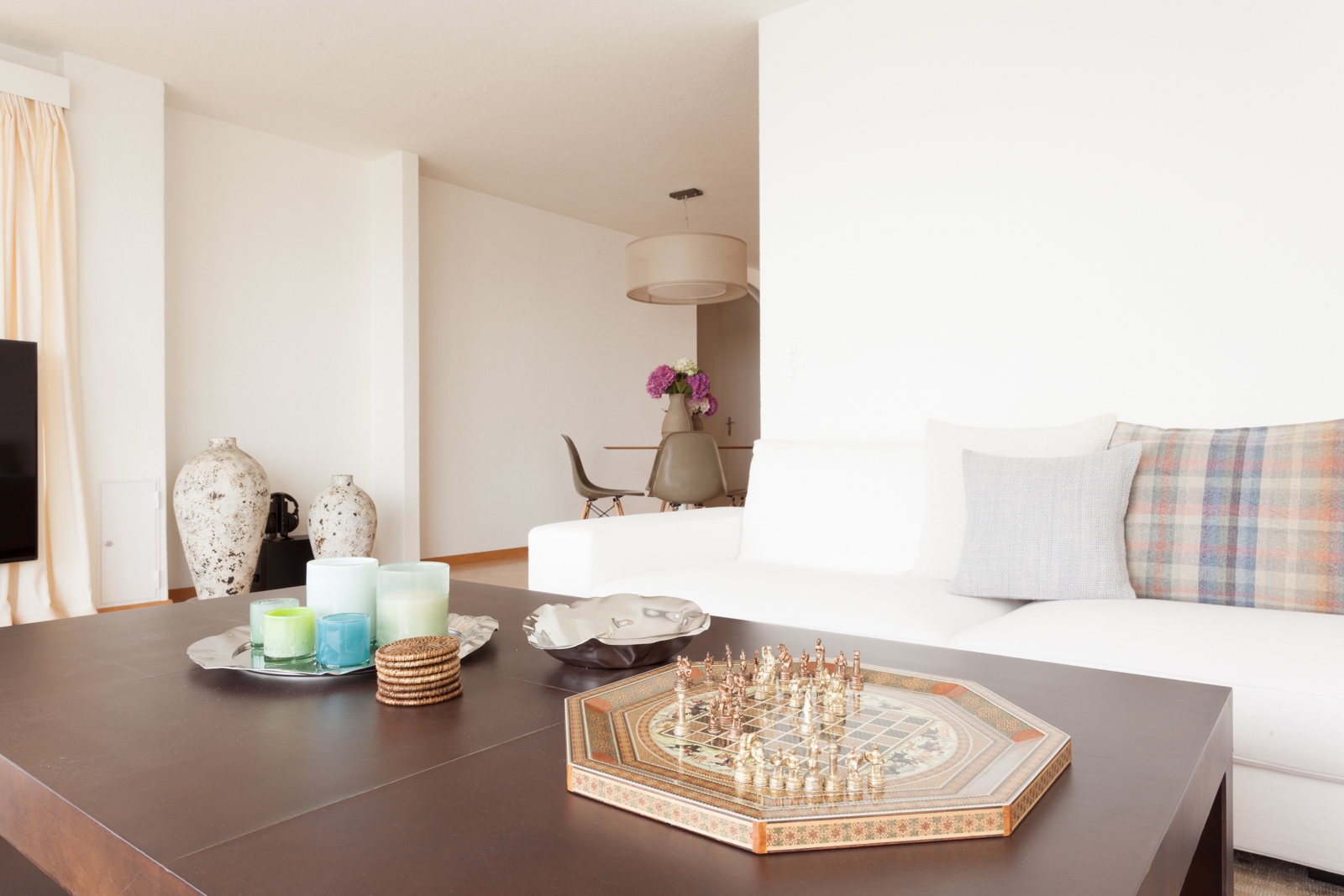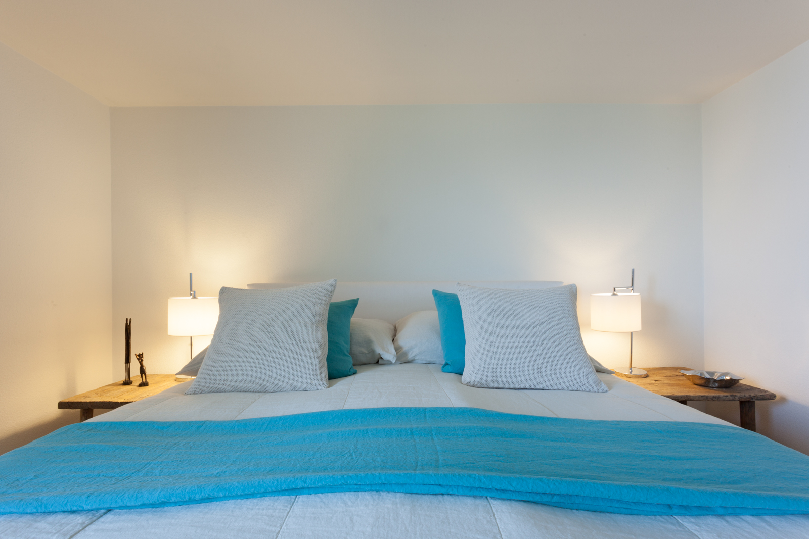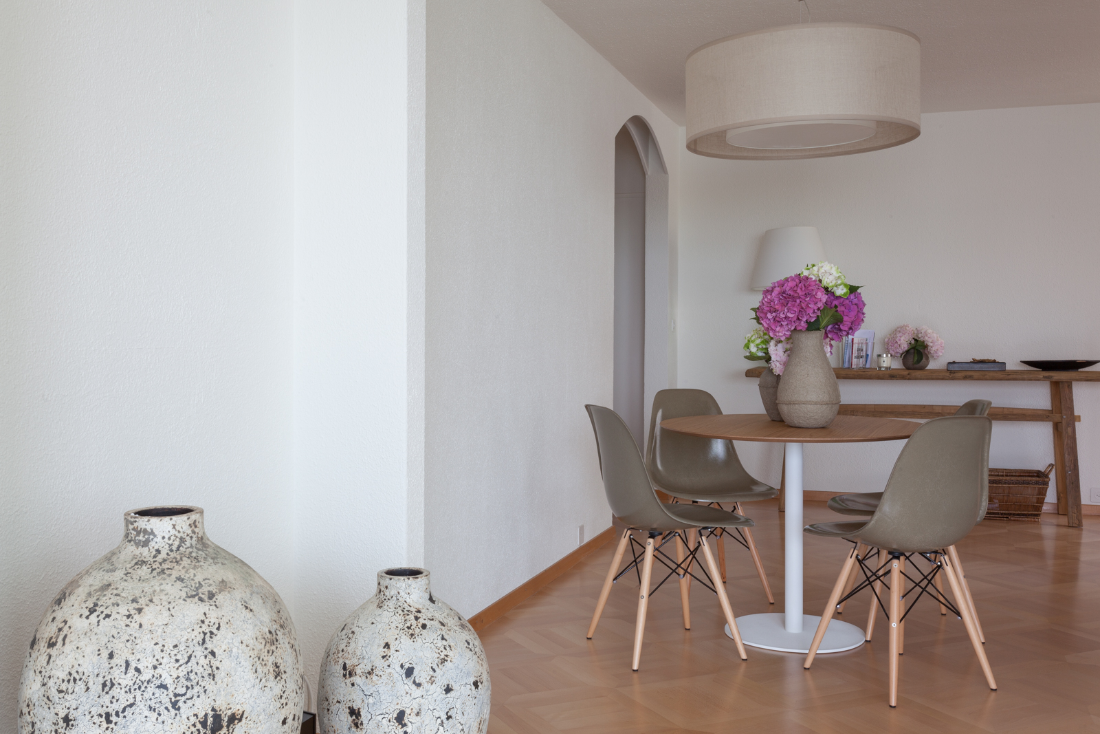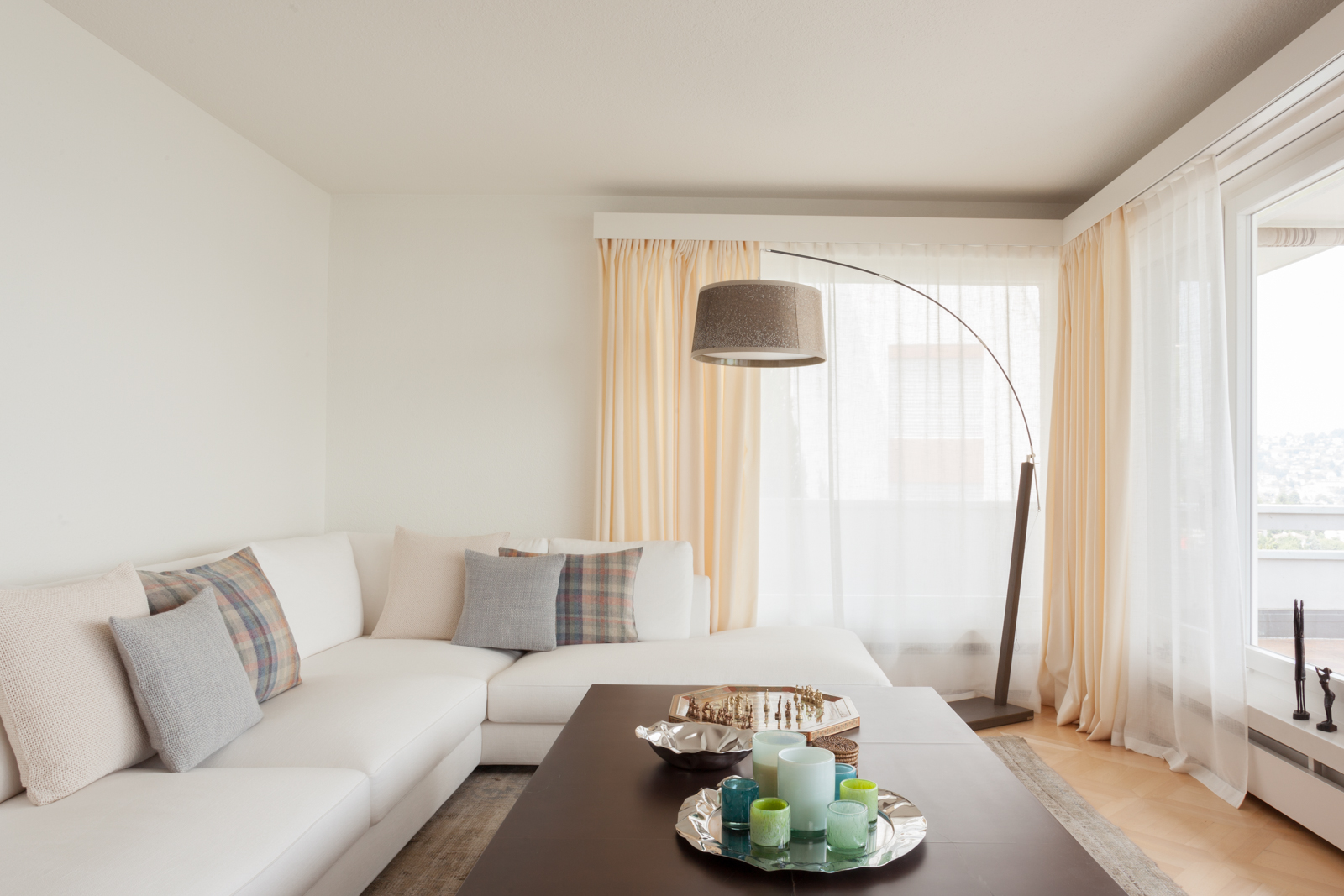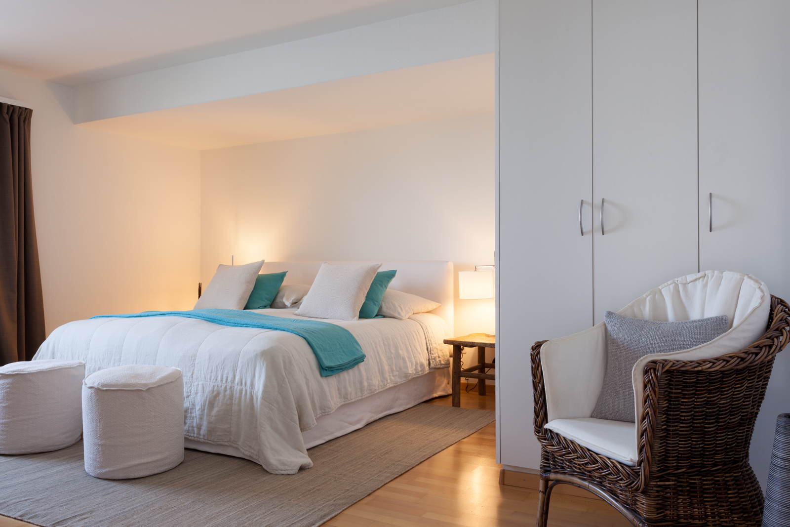 Die vom Kunden definierte Aufgabe; eine reine und neutrale Atmosphäre schaffen, die es einem erlaubt von der spektakulären Sicht zu profitieren! Nur das Notwendigste sollte erworben werden; schöne und qualitativ hochwertige Möbel in den Tönen ecru, weiß und beige würden in die Wohnung passen. Die Stimmung und die Einrichtung sollten wirklich sehr neutral und schlicht bleiben. Wir suchten edle Stücke aus; wie das ecru Sofa von Verzelloni, das weiße Schramm Bett, die übergroßen Teppiche, der eine Vintage, der andere von Vanghent aus Naturfasern. Wir kombinierten diese eleganten Möbel mit Altholz Möbeln, wie die beiden Seitentische am Bett oder die große Konsole im Eingang und dazu die Vintage Stühle von Eames mit den grauen Harzschalen um den modernen ovalen Tisch von Punt. Dieser Mix vermeidet, dass das ganze Ensemble von hellen und strukturierten Möbeln zu langweilig oder zu klassisch wirkt! Wir ergänzten das Ganze mit schönen leichten Lampen aus Stoff von Hind Rabii, Hocker und Kissen von Avec und Leinenvorhängen, in den Farben Vanille für den Wohnbereich und Kaki für den Schlafbereich. Um eine farbenfrohe, fast Ferienstimmung zu erzeugen, wählten wir Türkise Bettwäsche von Society. Sie erinnert an die Blaue Farbe des Sees, und gibt dem Kunden, die erwartete Ausgeglichenheit.