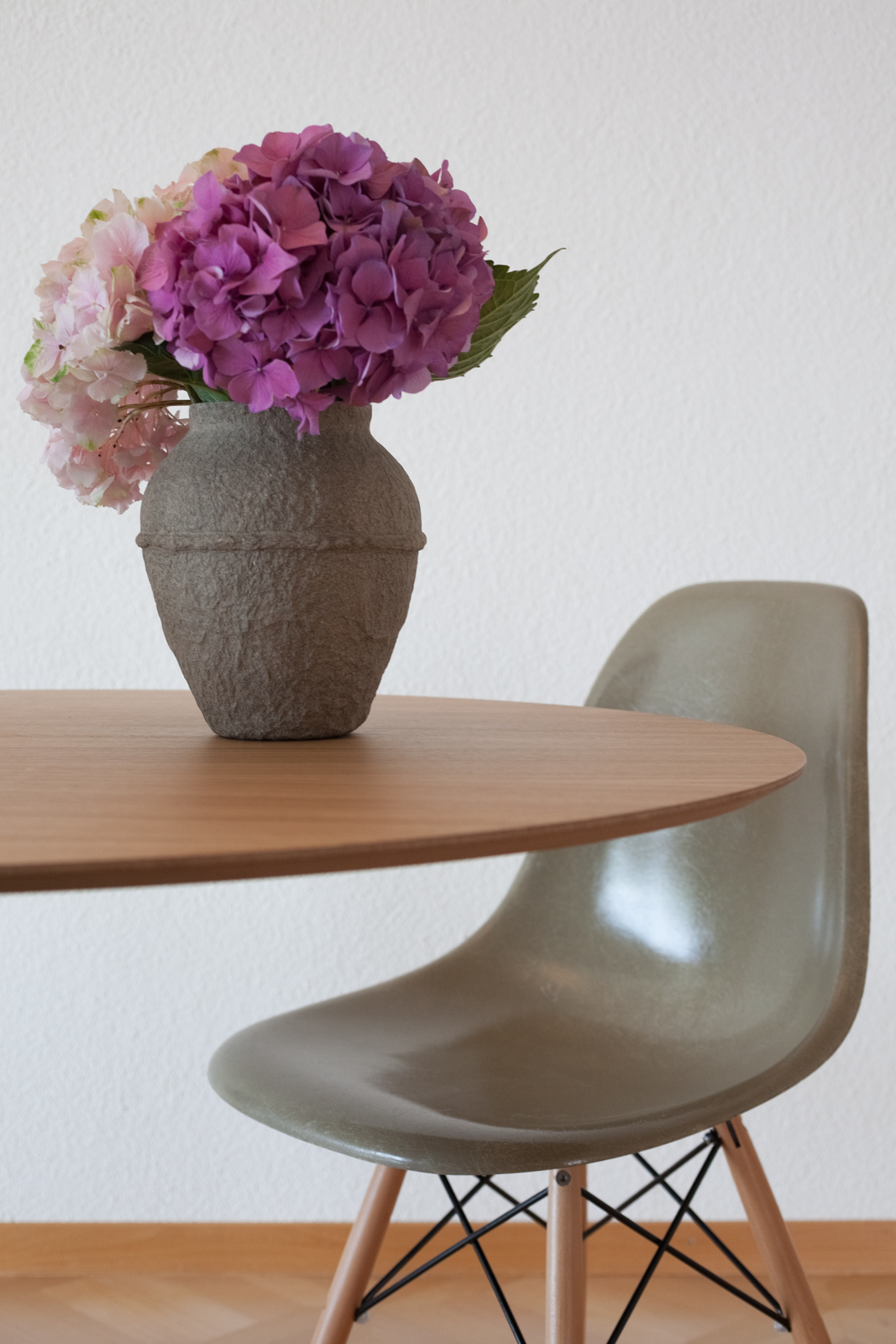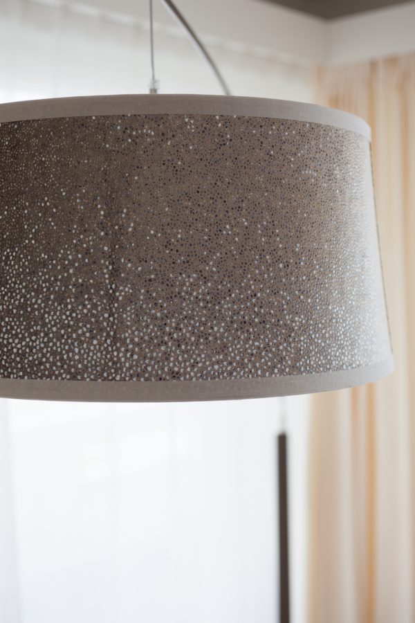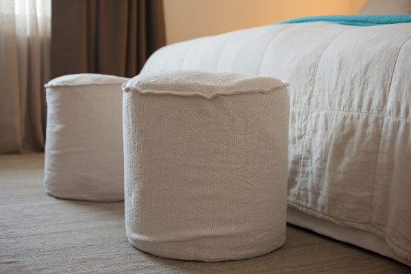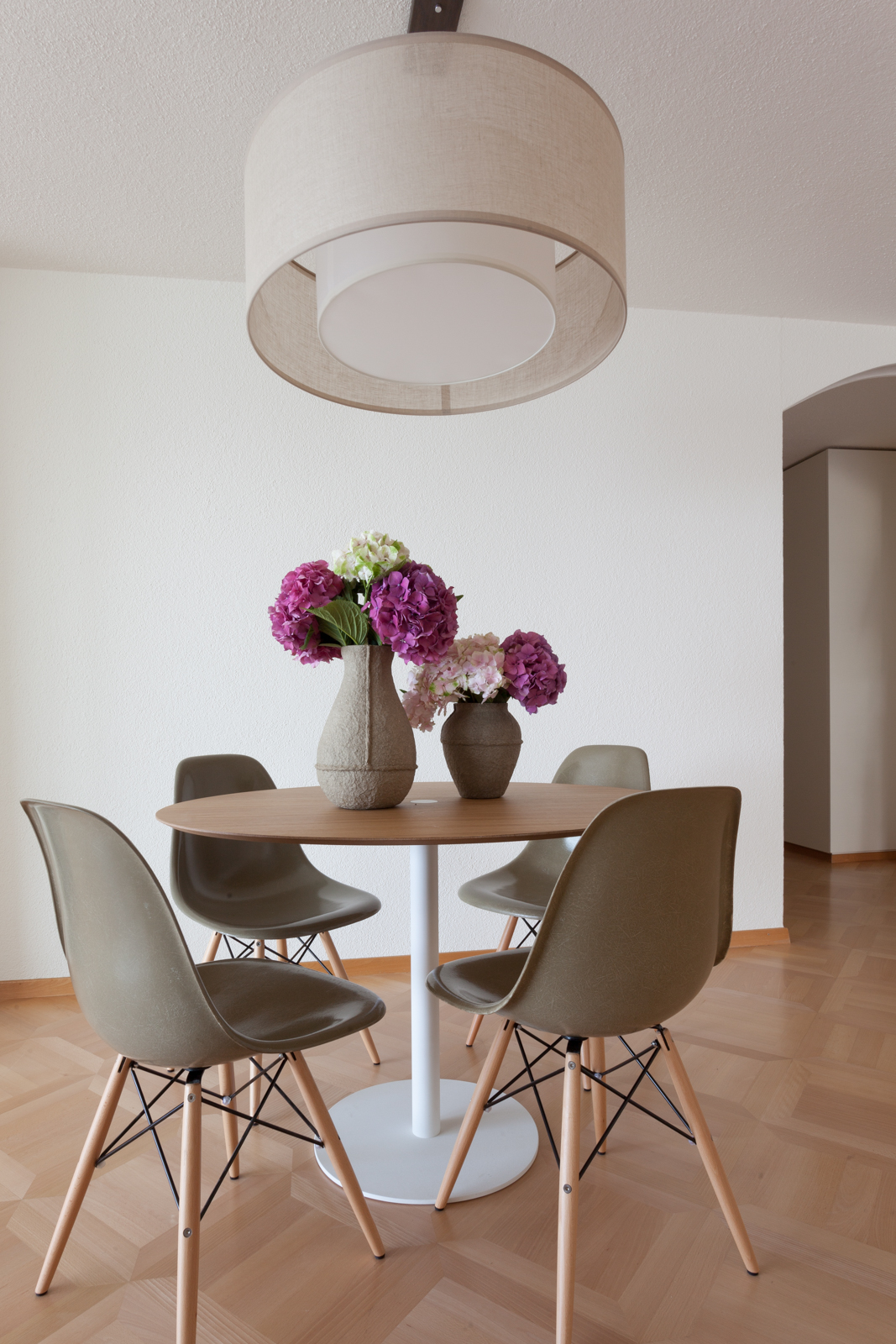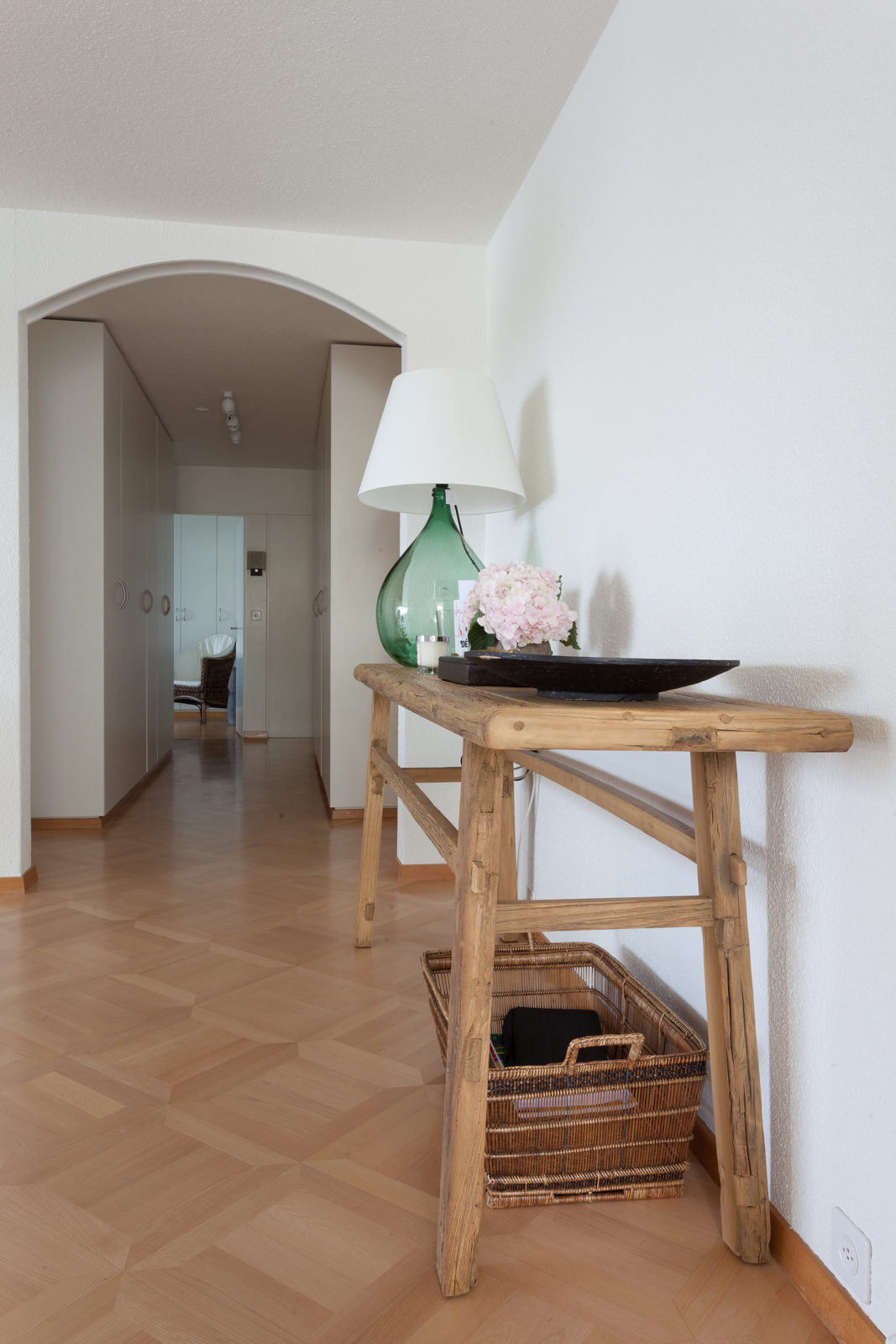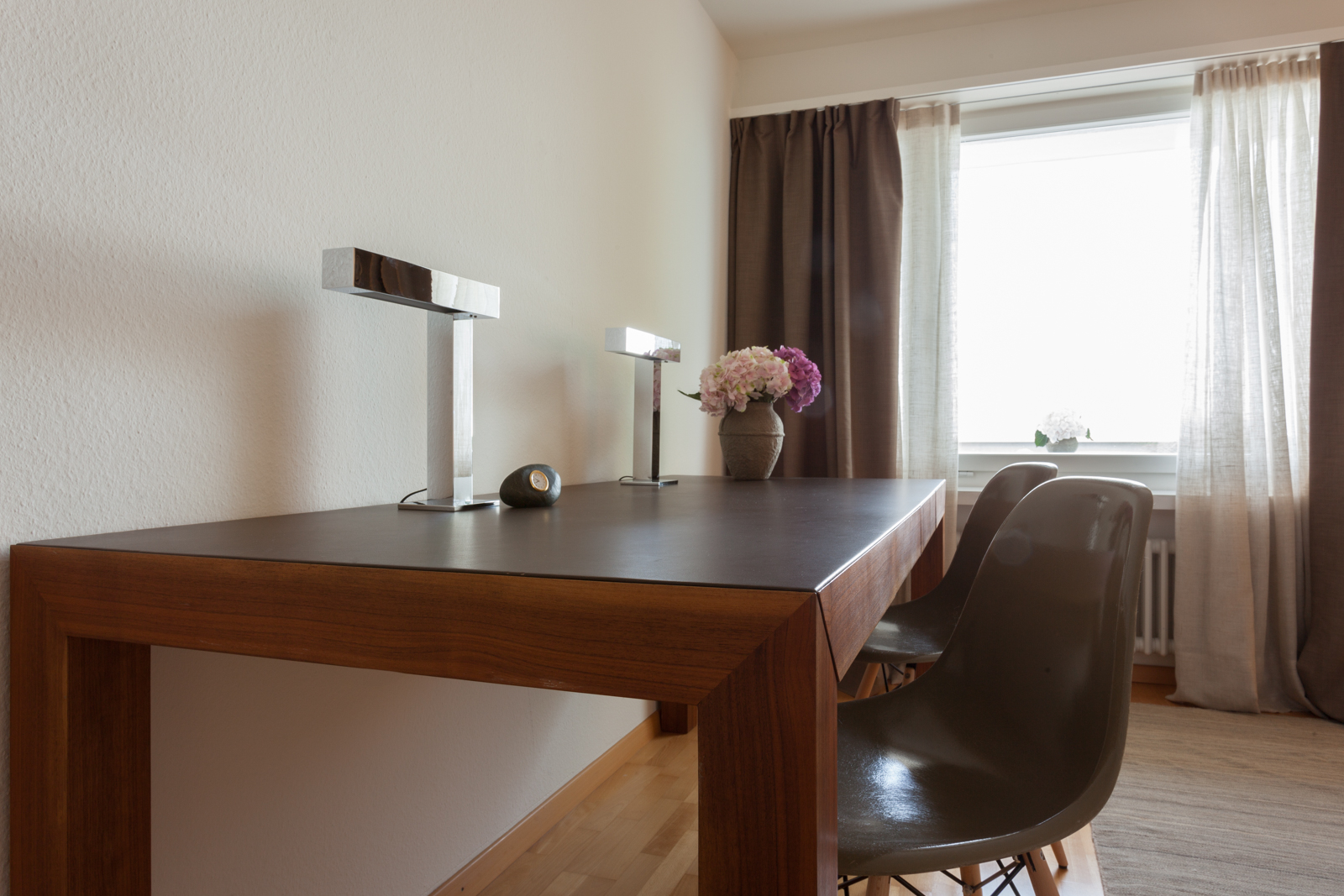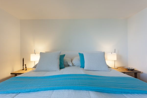 Die vom Kunden definierte Aufgabe; eine reine und neutrale Atmosphäre schaffen, die es einem erlaubt von der spektakulären Sicht zu profitieren! Nur das Notwendigste sollte erworben werden; schöne und qualitativ hochwertige Möbel in den Tönen ecru, weiß und beige würden in die Wohnung passen. Die Stimmung und die Einrichtung sollten wirklich sehr neutral und schlicht bleiben. Wir suchten edle Stücke aus; wie das ecru Sofa von Verzelloni, das weiße Schramm Bett, die übergroßen Teppiche, der eine Vintage, der andere von Vanghent aus Naturfasern. Wir kombinierten diese eleganten Möbel mit Altholz Möbeln, wie die beiden Seitentische am Bett oder die große Konsole im Eingang und dazu die Vintage Stühle von Eames mit den grauen Harzschalen um den modernen ovalen Tisch von Punt. Dieser Mix vermeidet, dass das ganze Ensemble von hellen und strukturierten Möbeln zu langweilig oder zu klassisch wirkt! Wir ergänzten das Ganze mit schönen leichten Lampen aus Stoff von Hind Rabii, Hocker und Kissen von Avec und Leinenvorhängen, in den Farben Vanille für den Wohnbereich und Kaki für den Schlafbereich. Um eine farbenfrohe, fast Ferienstimmung zu erzeugen, wählten wir Türkise Bettwäsche von Society. Sie erinnert an die Blaue Farbe des Sees, und gibt dem Kunden, die erwartete Ausgeglichenheit.